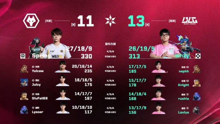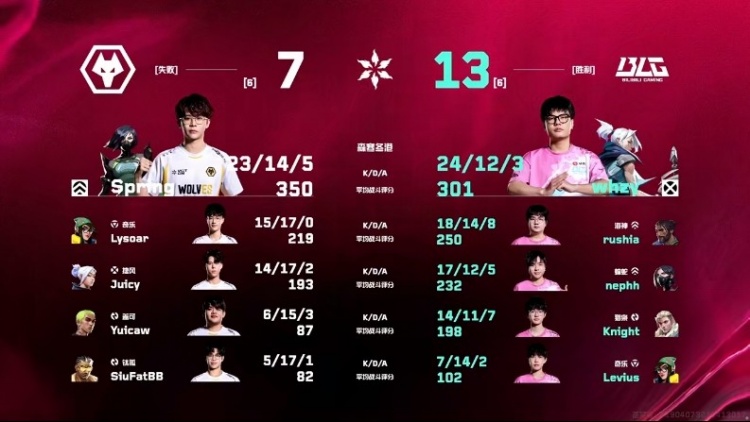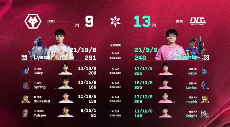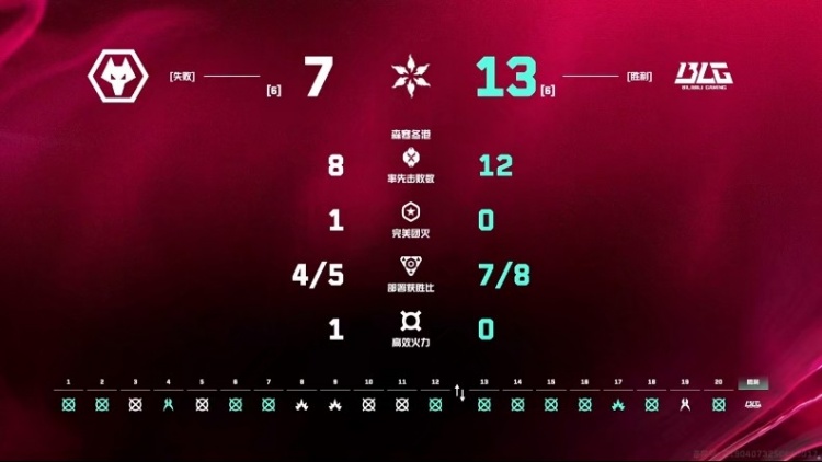 BLG拿下手枪局,狼队拿下奖励分后在第五回合在拿一分,但是BLG后续扳回一分将狼队经济打崩,但是狼队通过蝰蛇大招成功扳回一分后连续追分再拿四分,狼队上半场 6-6 BLG.下半场BLG拿下手枪局后直接不给狼队机会连续打出六连胜先拿赛点,狼队虽然强行追分但是面对分数差距还是被BLG拿下最终被BLG 13-7 拿下胜利!