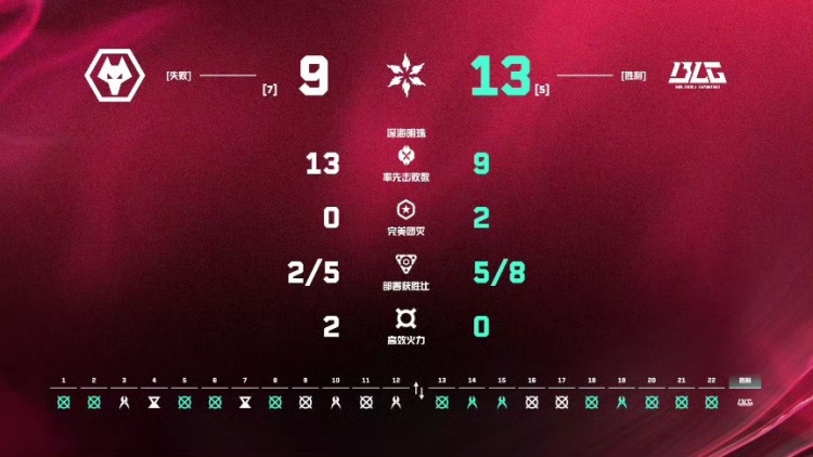 BLG拿下手枪局后拿下两分,狼队赢下奖励局后在第五局被BLG凭借夜戮大招成功扳回一分,后续双方互相拿分,BLG凭借个人实力的发挥成功在上半场打出7-5的比分,下半场BLG再次赢下手枪局,随后狼队也是在奖励局追上一分,后续狼队的进攻被BLG全部化解掉,BLG成功13-9 拿下第一局胜利!
