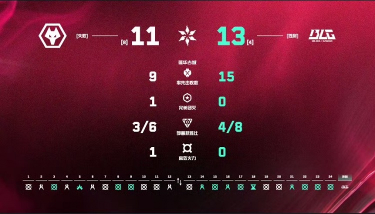 狼队拿下手枪局后被BLG在奖励局拿下一分,后续狼队不断拿分,BLG前七局仅仅拿到两分,后续BLG抓到机会连拿两分,但是狼队直接暂停挑战后连续拿下三分,狼队上半场 8-4BLG,下半场狼队再次拿下手枪局后继续托大优势,但是奖励局nephh拿下一波四杀成功帮助队伍扳回优势后拿下五连胜,后续狼队拿到十一分后一直没能拿到赛点后被BLG持续追分,BLG拿下四分后成功 13-11 拿下胜利!