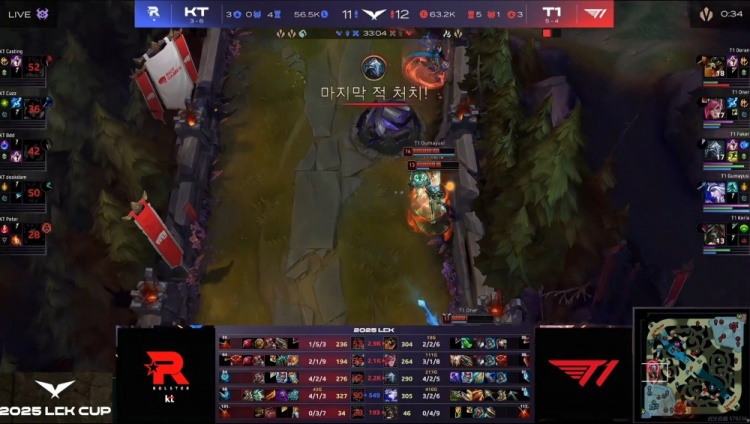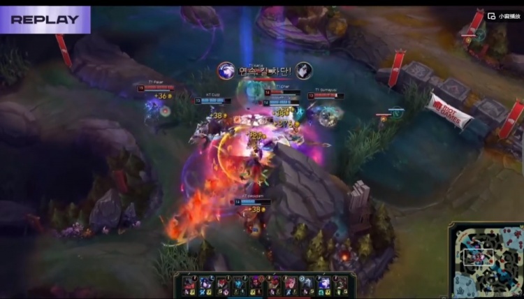 【32:45】KT野区打残Oner蔚之后开大龙,但是自己奇奇怪怪把阵型分为了两堆!T1抱团追击先秒Peter蜘蛛,Deokdam卡莉斯塔奋力开滑但是面对Faker维克托的巨型聚能环电圈根本没用啊!Doran鳄鱼跟进留人,T1一波轻松0换5,直接从上路一波结束了比赛!