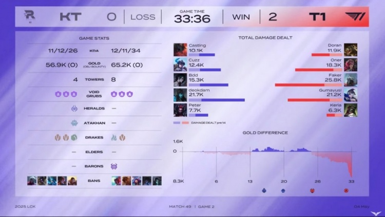 第二局T1选出艾希烈娜塔下路,但是KT针对性两波gank拿下了成效!KT一度取得经济的优势,而T1这边只有上路的Doran鳄鱼经济压住了casting剑魔!中期KT拿下听牌龙和灭尽厄塔汗,T1则是强杀剑魔+一路推掉了对手的上路双外塔!关键的大龙团KT先手打残了Oner蔚,但是自己被poke残了想撤,想撤还主动将队形分成了两份被T1直接追击!Faker维克托巨大的电圈铺路效果拔群!KT一个一个被留住,T1打出0换5团灭对手,大龙也不用拿了,直接从上路一波结束比赛!