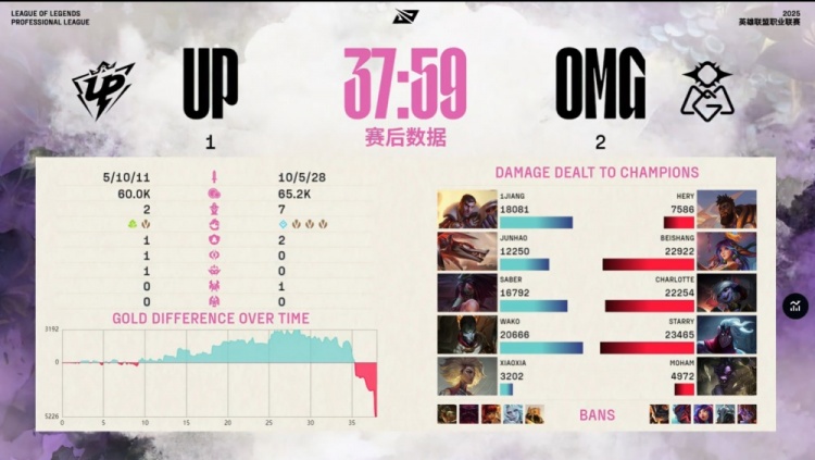中期龙魂团双方围绕大龙反复拉扯,UP中路发难,saber阿卡丽双召交出融化Starry韦鲁斯, 大龙团Charlotte小炮骑脸连杀三人,OMG打出0换3吃掉大龙,UP趁机吃掉荆棘厄塔汗后急忙按B回家防守,OMG高地之上等超级兵压境,强行拆掉OMG基地拿到比赛胜利,总战绩锁定为1-4,确定无缘LPL第三赛段。