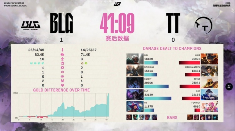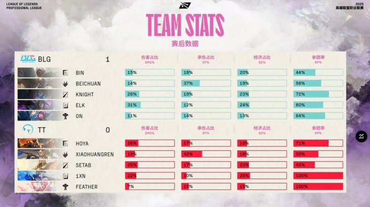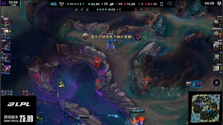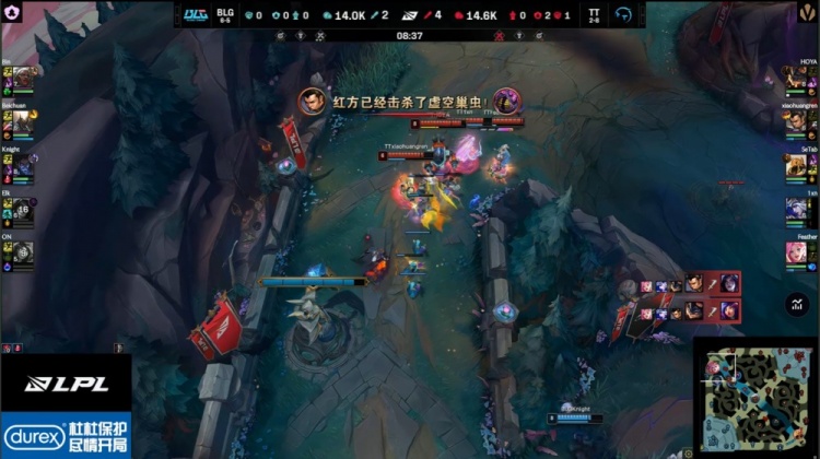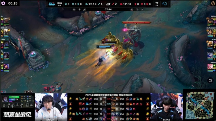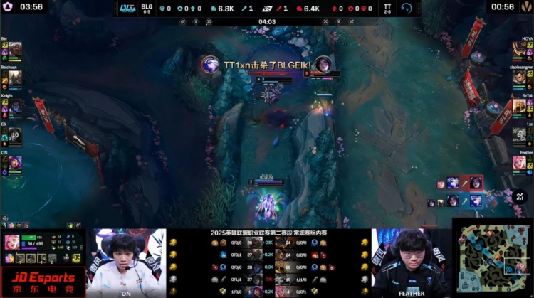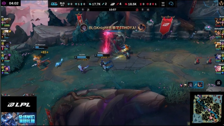 中期beichuan潘森中路跳大配合ON妮蔻开TT双人组,BLG打出0换2,随后先锋团阿Bin安蓓萨锁头hoya开团,knight拿到3个击杀,BLG打出1换4经济领先2k。小龙团knight再切1xn,TT节节败退,BLG团灭TT,经济领先5k。