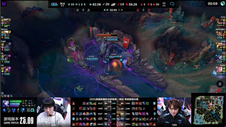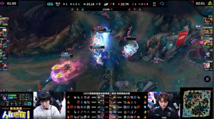 【13:02】中路beichuan潘森跳大,ON妮蔻开大控TT下路双人组,Elk卡莎跟上双杀,BLG打出0换2,比赛在这时暂停。