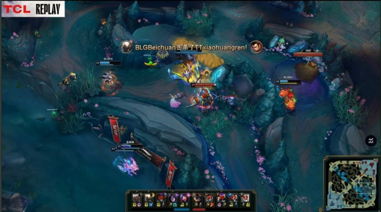 【8:19】巢虫团,ON被1xn艾希减速,xiaohuangren赵信跟上开捅,hoya兰博洒大,与xiaohuangren联手击杀BLG下路双人组,双方经济差距不大。