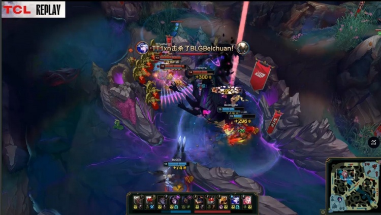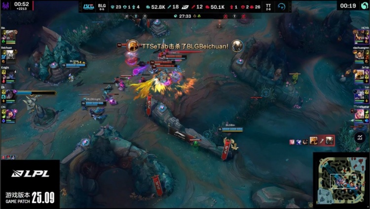【25:14】TT强行偷掉大龙,BLG发现为时已晚,小黄人吃掉大龙后阵亡,双方打野互换,TT经济落后3k。