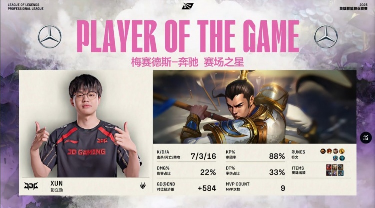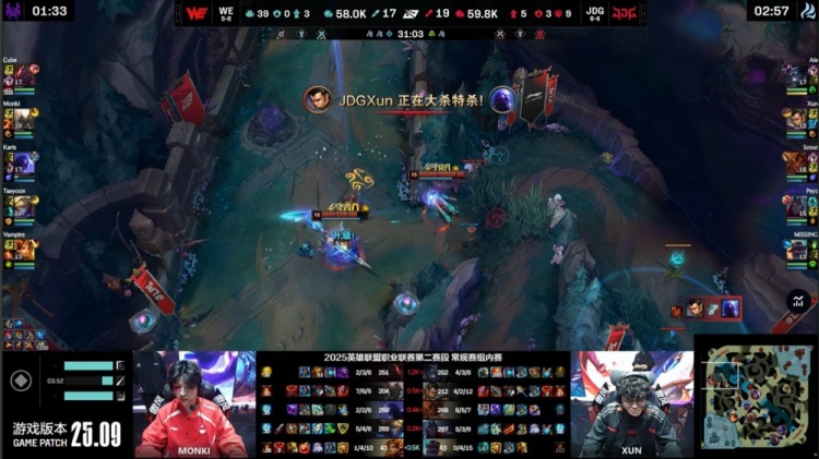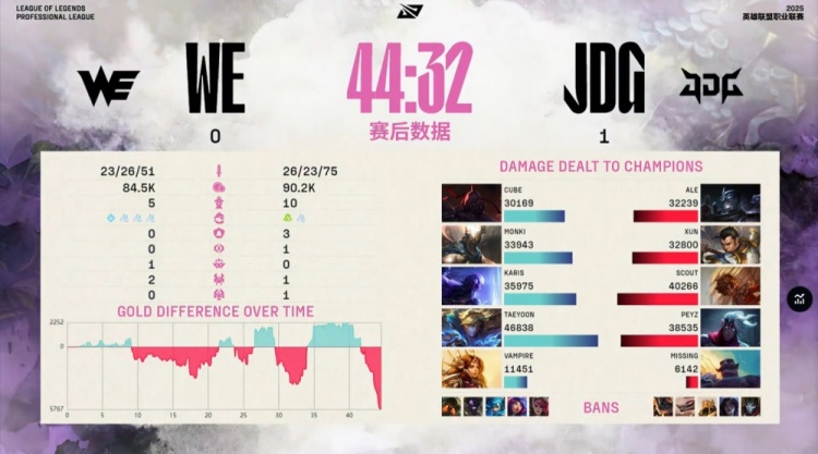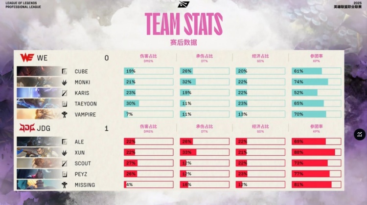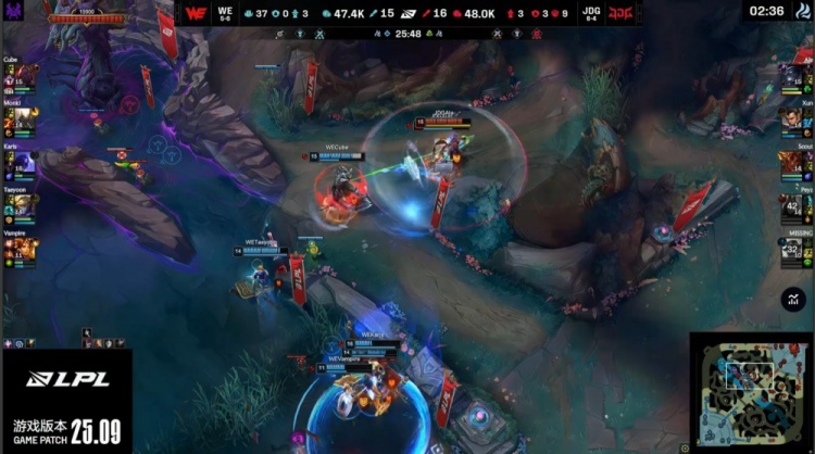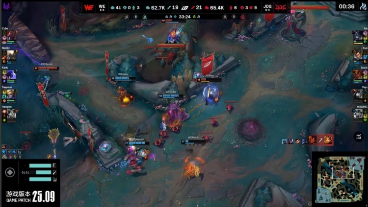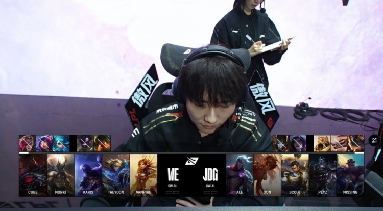 后期双方围绕大龙和远古龙展开拉锯,Taeyoon与Karis中路被秒后WE一度丢失中路水晶,但团战中Peyz多次被秒让JDG推进受阻。最终一波远古龙团,JDG打出2换3后成功拿下老龙,Xun强势开团,Scout岩雀抬两人,WE阵型被撕裂,JDG携双龙会一波终结比赛,先下一城。