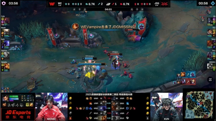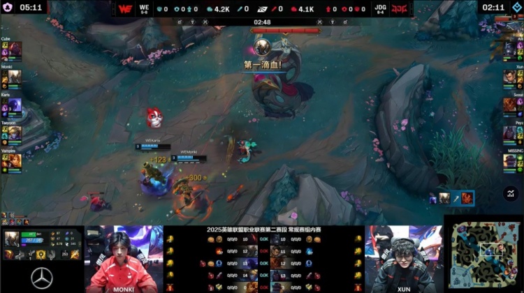 第一局前期WE中野多次控住Scout,Monki潘森配合Karis瑞兹中路拿到一血。JDG依靠下路团战节奏反扑,xun赵信捅飞WE双人组,Peyz韦鲁斯斩获双杀,JDG打出0换3建立经济领先。
