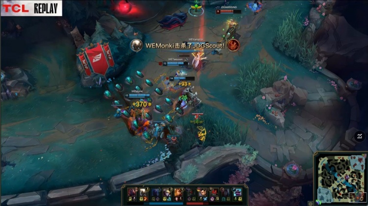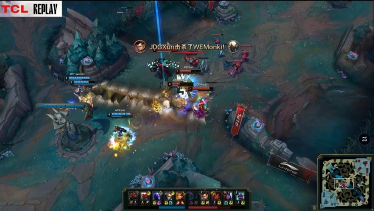 【40:38】中路混战,WE众人只想杀Peyz反而被杀三人,Taeyoon正面双杀,JDG打出2换3去开老龙,Cube与Taeyoon过来骚扰,但Monki在家读秒,Xun轻松吃掉老龙。