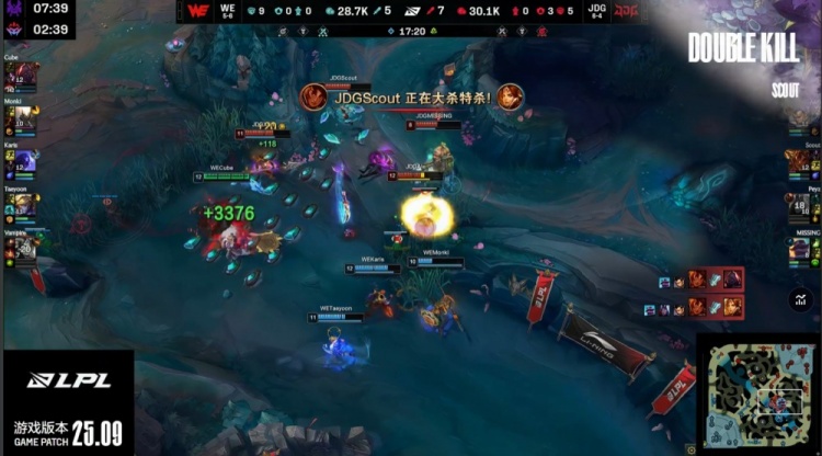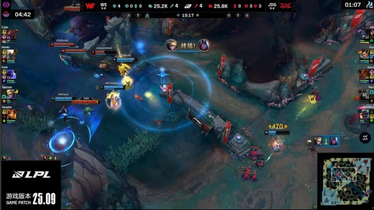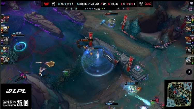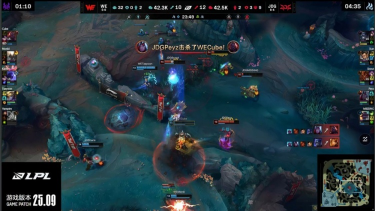 【25:01】Scout上路带线又被WE下路双人组击杀,WE直接开大龙,JDG四人过来接团,Cube赛恩开车开团Q飞JDG两人,JDG下路双人组瞬间被融化,WE打出0换2回头继续开大龙,Scout复活开车来正面,JDG三人还要骚扰,WE五人放手回头再杀Scout,Monki吃掉大龙被Ale击杀,WE经济领先2k。