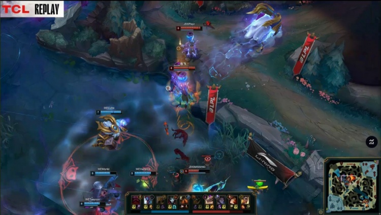 【8:25】河道团战,Vampire泰坦钩到Missing,Cube奥恩叫羊开团撞飞JDG两人,Scout塞拉斯反手叫羊也撞飞WE两人,Cube换掉Missing,Peyz再拿一个人头,双方经济持平。