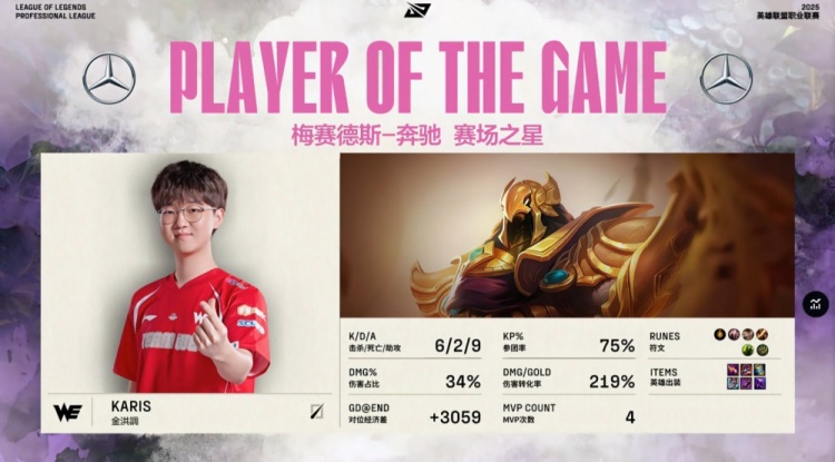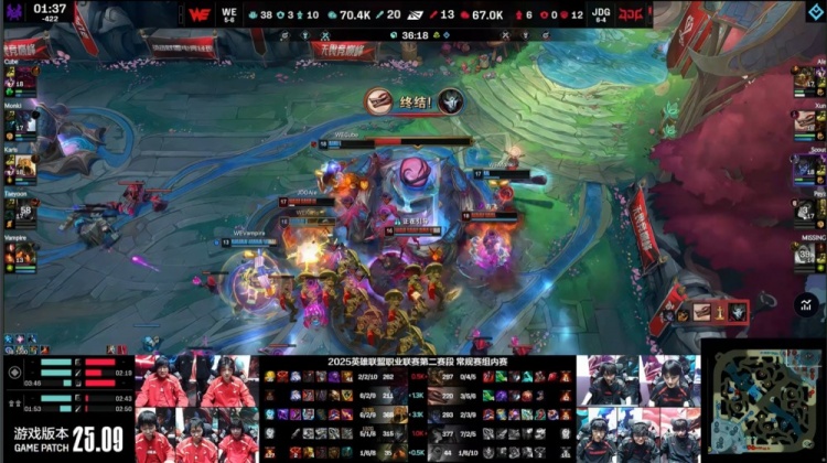 后期JDG高地反打,Scout塞拉斯先手终结Karis,JDG顽强守住水晶将经济差追至2k。关键大龙团Peyz女枪吃掉大龙,Scout塞拉斯TP下路偷掉WE门牙塔,但WE稳定应对反打1换4,乘胜追击一波推平JDG基地扳回一城。