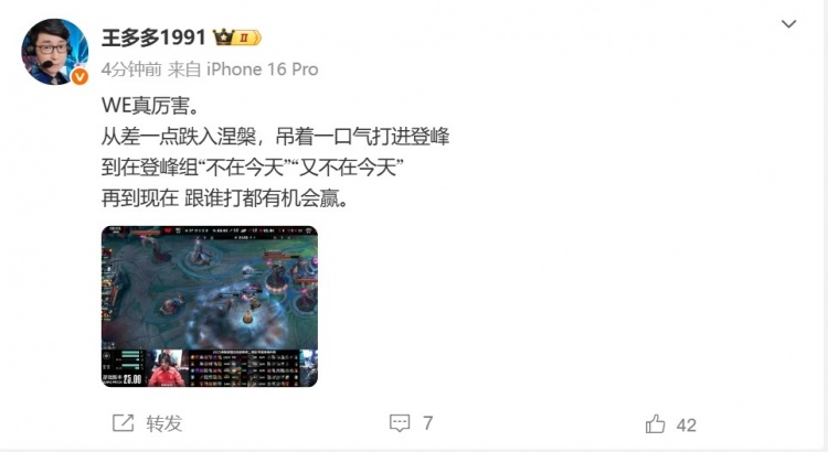 直播吧5月6日讯 2025LPL第二赛段登峰组常规赛,WE在对阵JDG的第二局扳平比分,将比赛拖入决胜局,对此LPL知名解说王多多发文称赞WE。