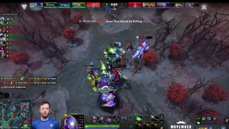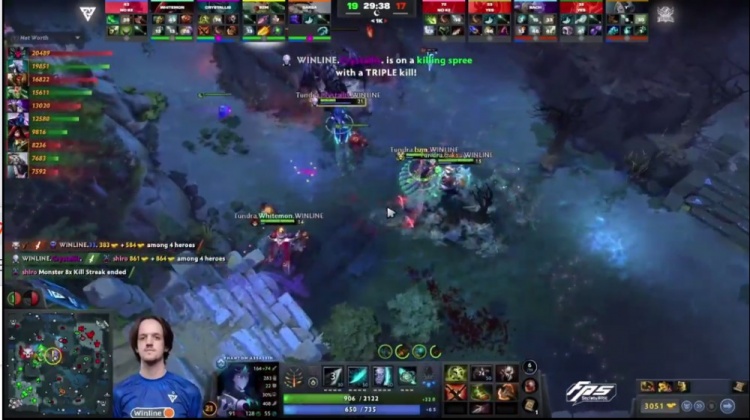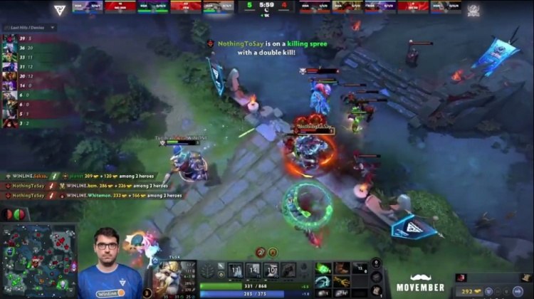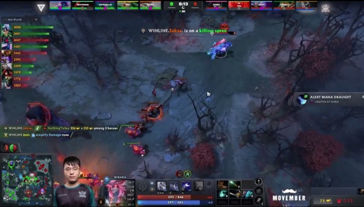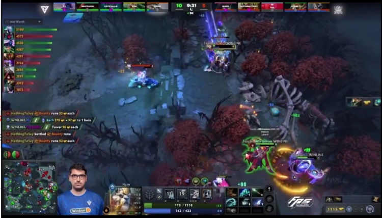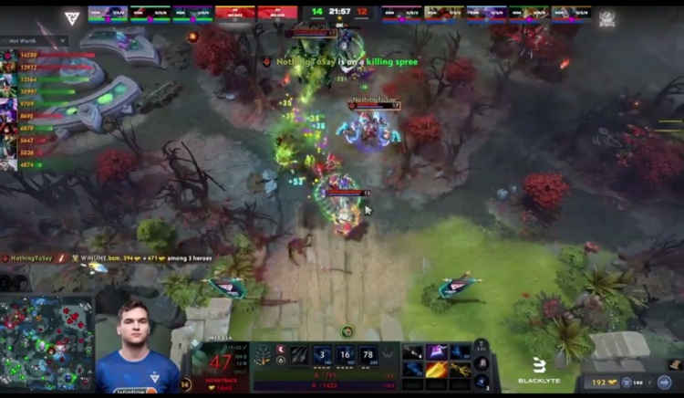 【5分钟】Tidebound下路抗压,被一路压制,上路被Whitemon术士致命链接压制血量,NTS中路兽王虽经济不落后,但一直被干扰。这时双辅助支援中路动手,NTS兽王一下飞斧反杀两人,扳回一点线上经济劣势。