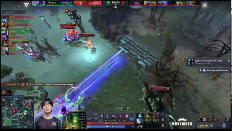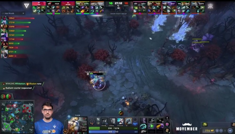 【26分钟】Tundra中转上的时候,planet司夜刺客隐身出来刺大接队友爆发直接秒了幻刺,随后Tidebound追出来,Saksa海民滚雪球带回去33谜团,谜团倒地,海民跳加冰墙秀了起来,独自逃生。