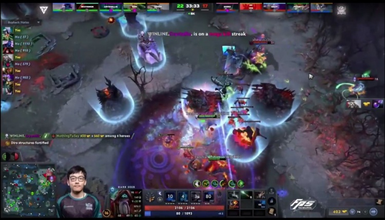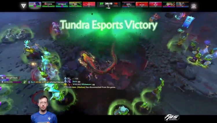 【25分钟】双方中路遭遇,Tundra技能全,不光断了Bach黑贤拉墙,还击杀了y米拉娜。在Tidebound减员且关键技能不全的时候,Tundra中路上高,拆掉了中路高地。