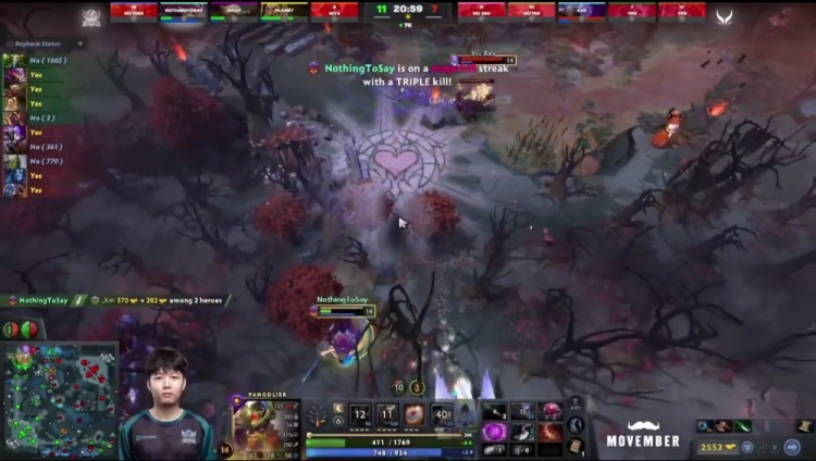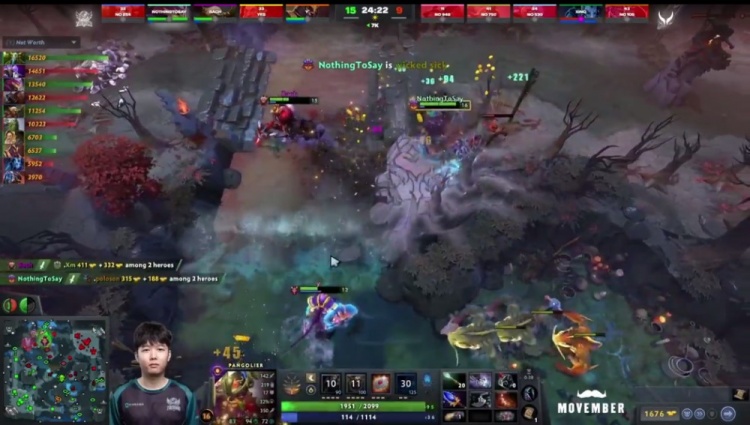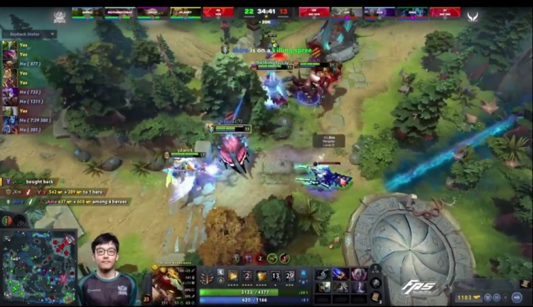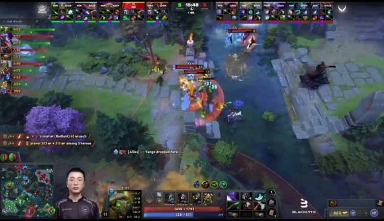 【24分钟】Ame熊战士刷钱被Tidebound全队包夹过来,熊战士开大招BKB撤退还是被远程一下波击杀,XG再次选择在熊战士倒地的情况下追击,虽然xm小小和xxs黑贤秒了先知,但是残局再次被NTS石鳞剑士秀飞,XG再被打一波四人阵亡,经济落后达到7K。