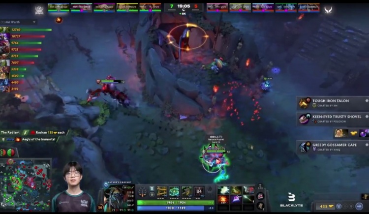 【18分钟】Ame熊战士打肉山,Bach半人马过来踩晕三人,双方拉扯撤退,在熊战士大招真空期Tidebound集体回头打掉了残血肉山,shiro先知带盾。