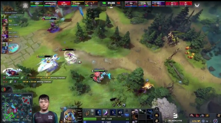 【27分钟】xm小小丢回来一个y沉默,Bach半人马开大救人,XG大部队进攻路过击杀planet光法,小小在沉默上高前找到机会跳过来击杀残血沉默。XG杀人控肉山,Ame熊战士带盾。