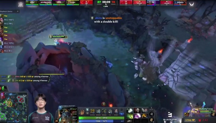 【38分钟】双方爆发肉山团战,在被先手的情况下,xxs黑贤和xm小小没有打出联动,被拉扯时间过长,shiro先知输出打满,XG被打一波四人阵亡。