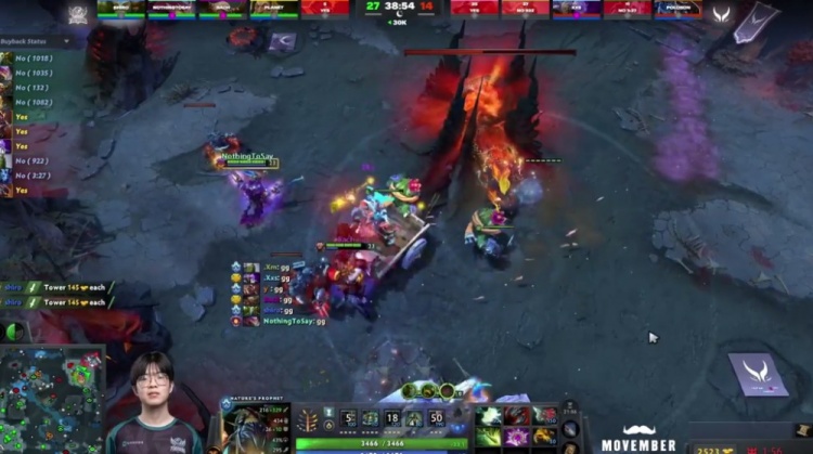 【34分钟】Tidebound下路捉到poloson双头龙,xm小小过来想要山崩投掷留人,却发现正面输出不足被,Ame硬刚正面被shiro先知击杀。Tidebound继续下路推进,xm小小被发现后倒地,Tidebound拿下下路高地,经济领先超过20K。