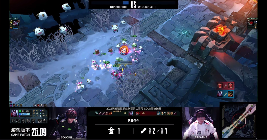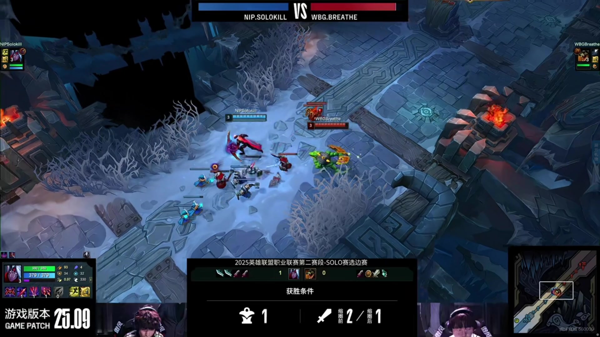 上线Solokill凭借韦鲁斯长手优势不断压打,完成对呼吸哥鳄鱼击杀拿下一血。双方整补完毕,呼吸哥鳄鱼率先出手但是被Solokill反打至残血。决赛圈前,双方完成最后一波出装,决赛圈呼吸哥率先发难,但是Solokill反打完成击杀赢下SOLO,NIP首局选蓝。
