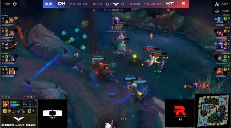 【6:35】河道混战,Peter女坦指进人群开团,许秀飞机先被bdd瑞兹带走一血,随后Lucid反手带走bdd,正面混战,BeryL芮尔残血被杀,女坦再指Lucid莉莉娅,Cuzz猴子双杀,KT打出1换3,经济领先1k。