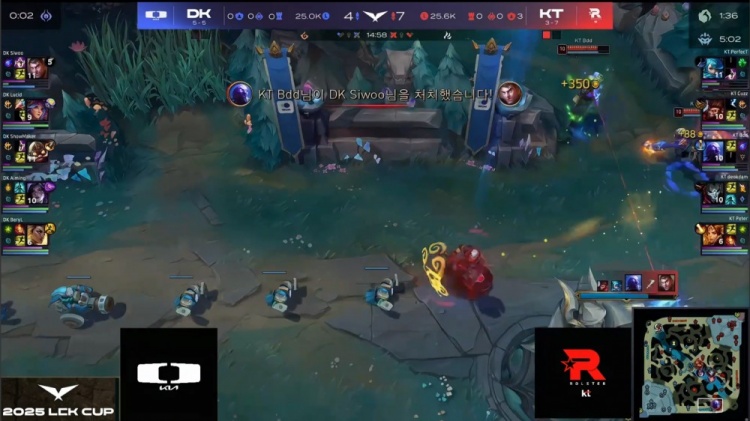 中期先锋团Siwoo被Cuzz猴子强开致死,decksam烬架狙击杀Lucid,KT打出0换3,经济领先3k。DK随后搏命开厄塔汗却被Cuzz抢掉,Perfect格温进场狂砍四杀,KT打出2换4。