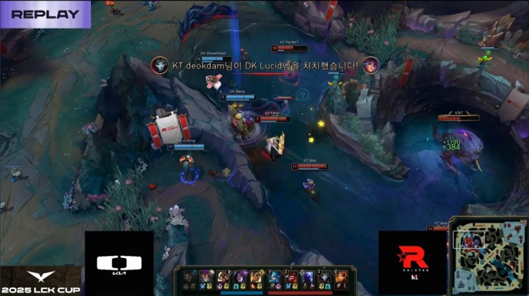 【11:50】上路2V2,BeryL芮尔强势开KT双人组,双方辅助互换,bdd瑞兹河道迷路被siwoo逮捕。随后KT三人上路越塔逮捕Lucid。