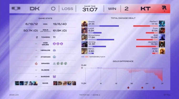后期DK开大龙逼团被KT反打,Siwoo阵亡DK让掉大龙,KT野区找人带走BeryL后推掉DK上路二塔,经济领先1w。最终KT摧枯拉朽冲上DK高地,deokdam架狙单杀Siwoo,KT强行推平DK基地拿到比赛胜利。