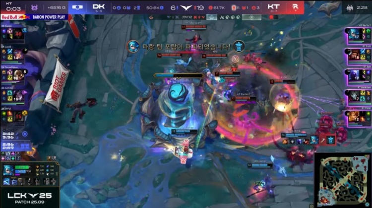 【27:25】DK去开大龙,KT过来接团,侧面野区Siwoo先被KT四人融化,DK众人急忙撤退,KT五人吃掉大龙,