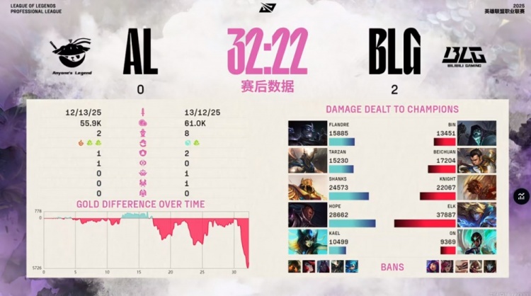 【30:43】中路Elk伊泽瑞尔直接前冲打残Hope卢锡安!随后Beichuan赵信交闪开戳,knight岩雀更是大招想强杀!虽然AL支援赶到,但是ON卡尔玛一个RQ配合坩埚没有让岩雀被秒,拉扯中岩突带回了潘森,BLG抱团集火强杀Tarzan潘森!回头拿下大龙!随后knight岩雀绕后大招+岩突配合队友秒了Shanks沙皇!打出0换2的BLG一路前推拆掉中路高地想一波!Tarzan潘森给大拖时间被拉扯,BLG击杀AL四人结束比赛!横扫AL豪取四连胜!