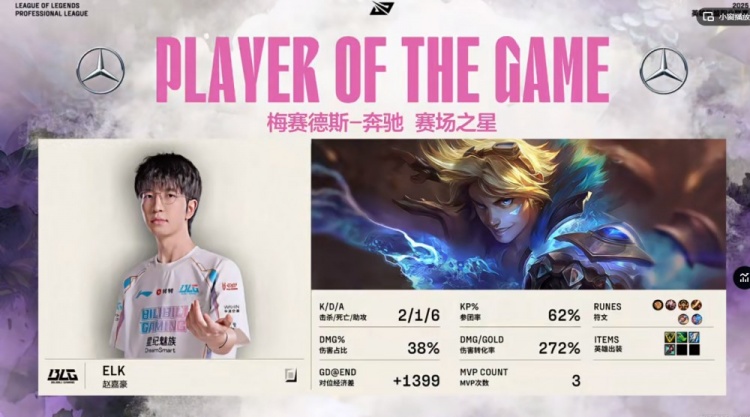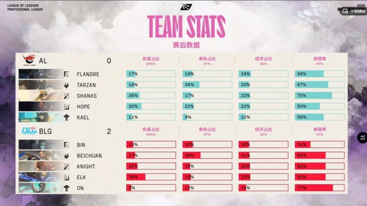 BLG:上单Bin、打野Beicuhan、中单knight、下路Elk、辅助ON
