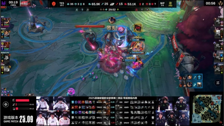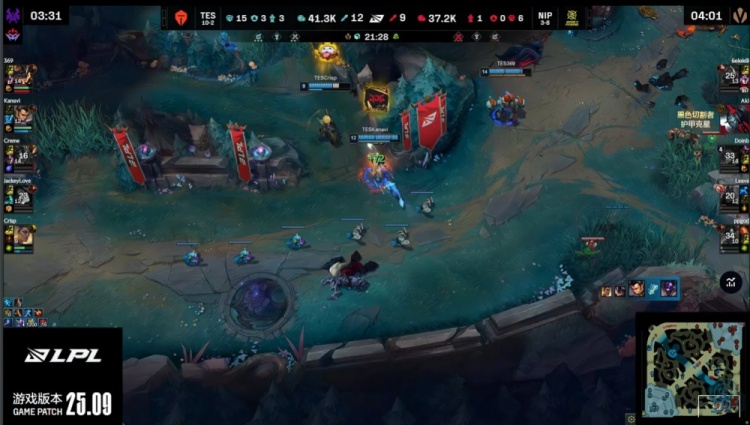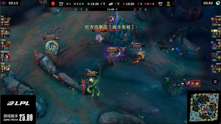【20:28】TSE吃掉小龙,Creme岩雀封路,刘神芮尔W过墙,Creme下路被pgod牛头绕后留住,Leave吃掉Creme终结人头,Kanavi捅进人群狂砍双杀,哥哥被Aki潘森换掉,369兰博火烤战场收割,TES打出3换5团灭NIP,