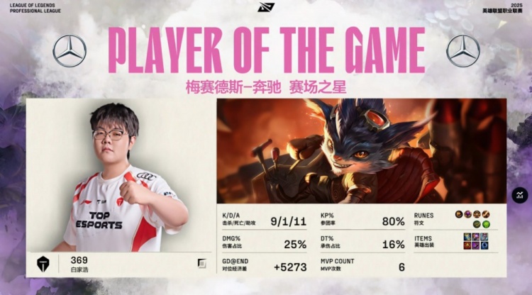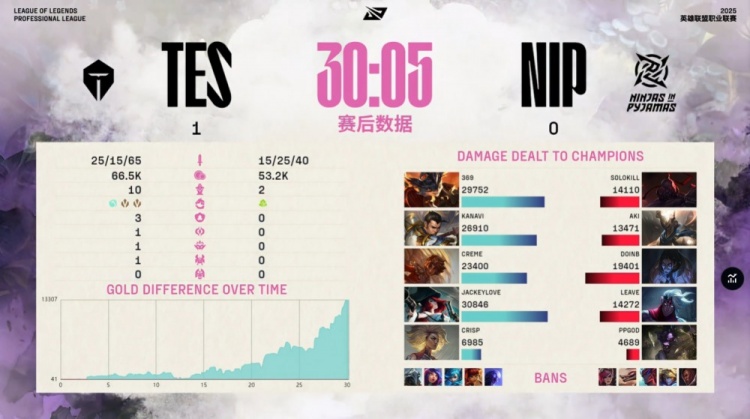 中期双方围绕小龙反复拉扯,369兰博火力全开,团战伤害拉满,TES连战连捷多次团灭NIP后吃下厄塔汗。