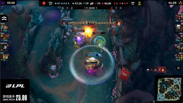 第一局前期Kanavi赵信节奏拉满,TES下路三人强开收下ppgod一血,但哥哥女枪上路走Solokill赛恩脸上遭其单杀。TES围绕上半区控到三虫与先锋,接连入侵NIP野区收割资源,虽然一波入侵被反打回击,但总体经济小优。