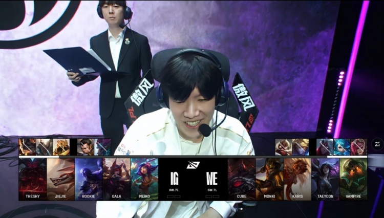 中期先锋团Cube赛恩开车撞飞TheShy,Meiko妮蔻大三人,Taeyoon卡莎飞脸带走GALA后再杀Rookie与jieije狂轰三杀,WE打出1换4。