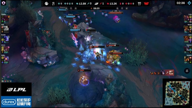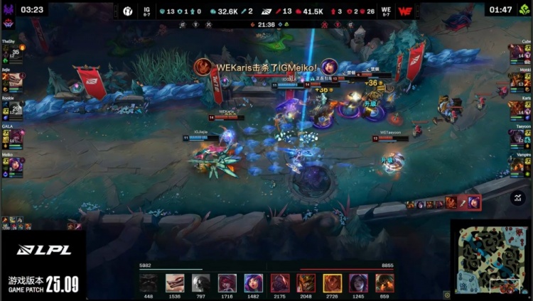 【11:55】iG去开小龙,Cube开车来正面,Monki皇子抢掉小龙,jiejie冥犬锁头残血Cube反而被Vampire击杀,Meiko妮蔻野区原地空大,TheShy奥恩1v3被杀,GALA霞收掉Taeyoon,iG中上野被杀,WE打出1换3,经济领先4k。