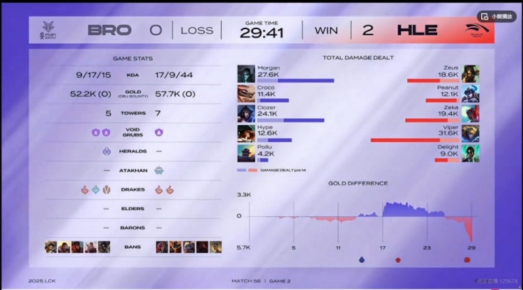 第二局比赛Clozer阿狸对线压制Zeka永恩+对位单杀!不过Zeus豹女也在上路对位单杀掉了Morgan约里克!16分钟小龙团HLE拿下小龙+击杀BRO下路组但是多人残血,BRO上野带队冲锋,Croco纳亚菲利一波三杀帮助队伍打出2换4拿下优势!但是随后Clozer阿狸连续白给,HLE打回经济差!决胜龙魂团HLE猪妹永恩打出Combo链,Zeus豹女跟闪收割拿下双杀,HLE打出0换4之后中路一波结束比赛!