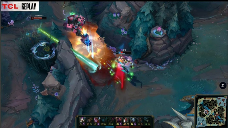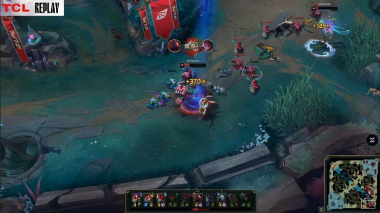 【7:20】河道团战,shadow赵信被Tarzan巨魔柱子减速直接回头E脸开团击杀Tarzan,Flandre赛恩蓄满Q击飞sheer将其留下,sheer卡蜜尔钩锁CD,shanks维克托侧面激光补伤害,Flandre赛恩拿到人头,AL打出1换2。