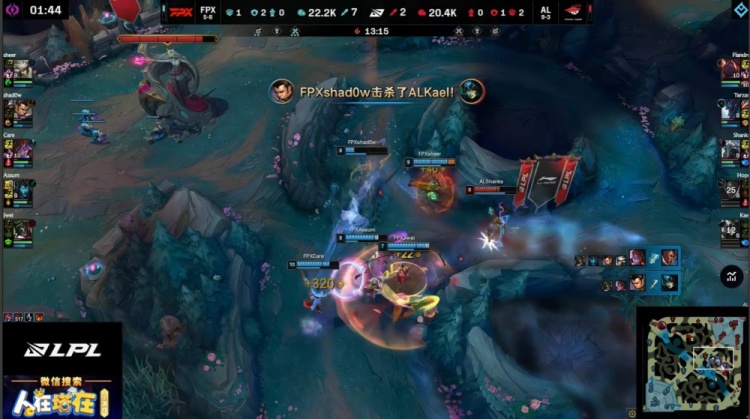 【6:17】下路3V3,Shadow赵信直接冲进AL三人之中,Care阿萝拉绕后开大留人,王杰与Kael瞬间阵亡,FPX打出0换2。