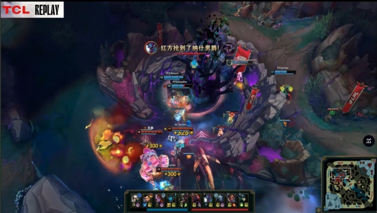 蓝色方FPX:sheer卡蜜尔、Shad0w赵信、Care阿萝拉、Assum卡莉丝塔、Jwei烈娜塔