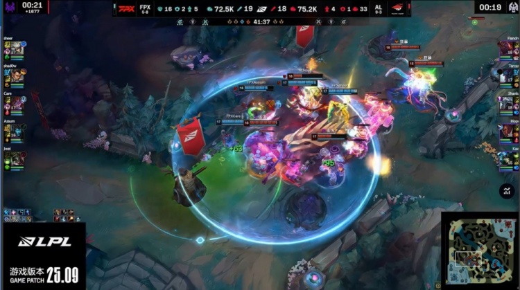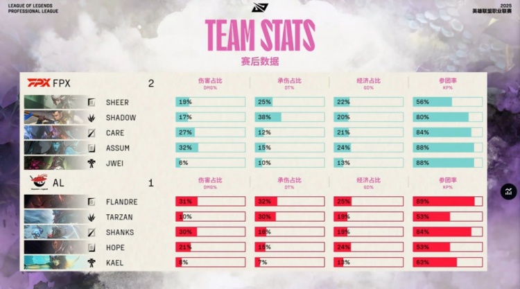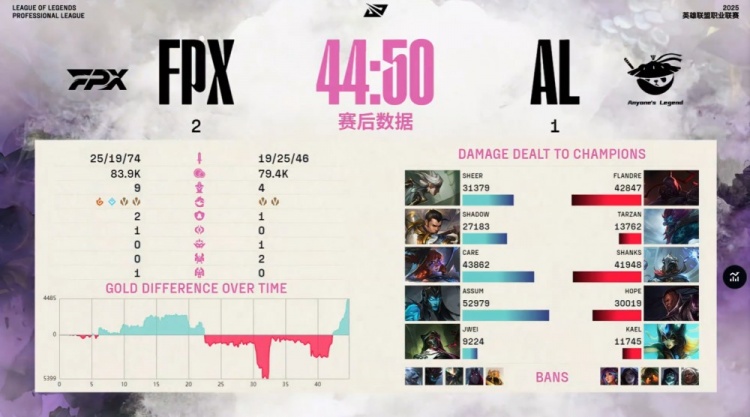 后期Flandre赛恩不在正面,中路FPX五人强开AL四人瞬间打出0换4,推平AL中路水晶,双方经济持平。龙魂团x2,Shadow帮助FPX吃掉土龙魂。后续FPX开大龙被Tarzan抢掉,AL经济反超3k。AL中路推进,Jwei烈娜塔反手大AL五人,Flandre城墙倒塌,FPX打出0换2吃掉老龙,下路一波冲上AL高地打出1换4,sheer三杀收尾,FPX推平AL基地拿到比赛胜利。