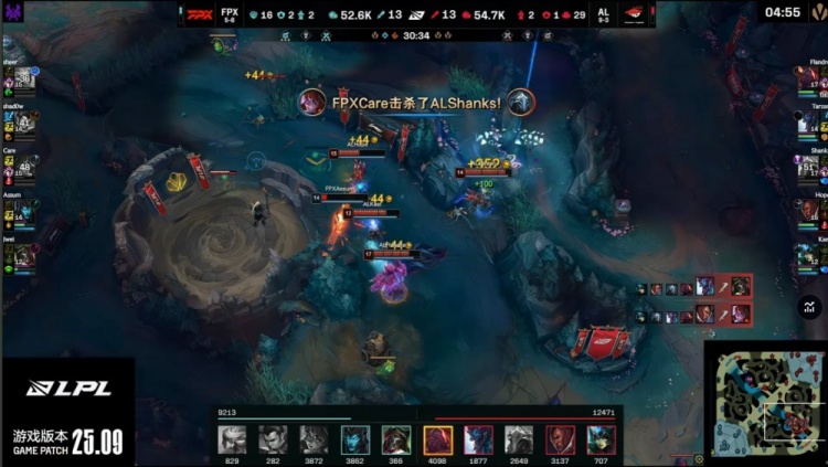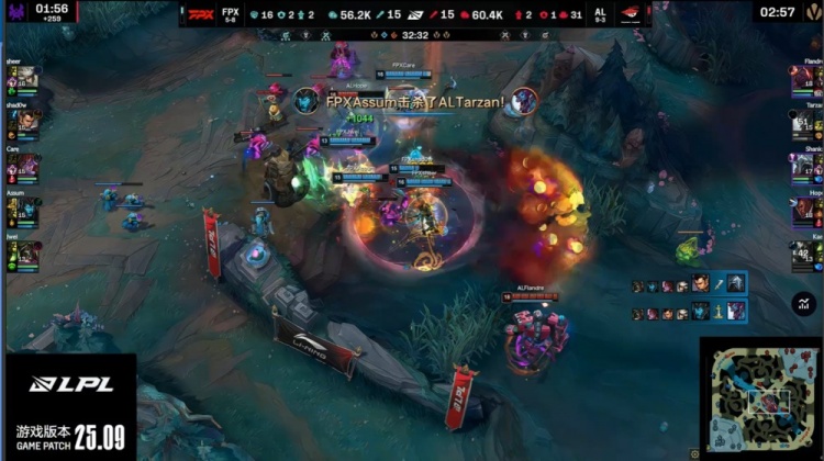【32:39】中路团战,Care阿萝拉框AL四人,Flandre城墙不在正面,AL四人瞬间束手就擒被融化,Assum拿到双杀,FPX打出0换4推掉AL中路水晶,双方经济持平。