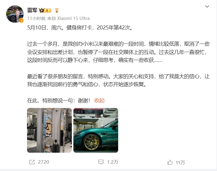 直播吧05月10日讯 小米集团创始人、董事长兼 CEO 雷军刚刚在其个人微博发布动态,这是其自小米 SU7 事故后首次公开表态(平时会有运营人员打理账号),也是其停止互动一个多月后的明牌回归。