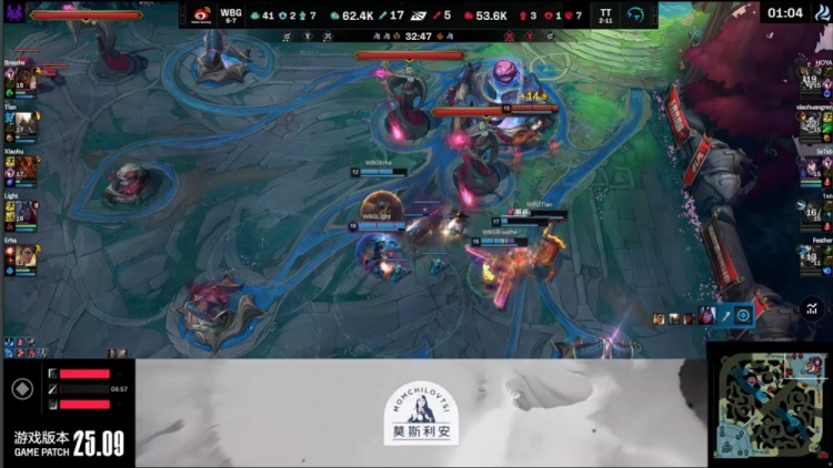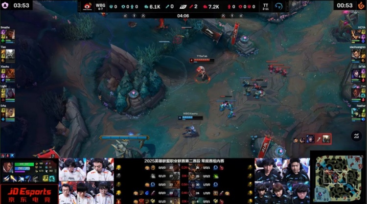 【22:15】中路团战,小天跳大落地控1xn卢锡安得手瞬间将其融化,WBG打出0换1,轻松吃掉荆棘厄塔汗,经济领先2k。Setab上路二塔被Breathe逮捕,Light与Breathe推掉TT上路二塔,小黄人吃掉小龙。