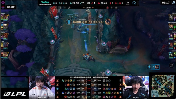 【15:25】Feather娜美中路被小天潘森留下,Breathe奎桑提轻松收头,HOYA上路推线被抓,逃至WBG上路二塔交出闪现送塔成功。