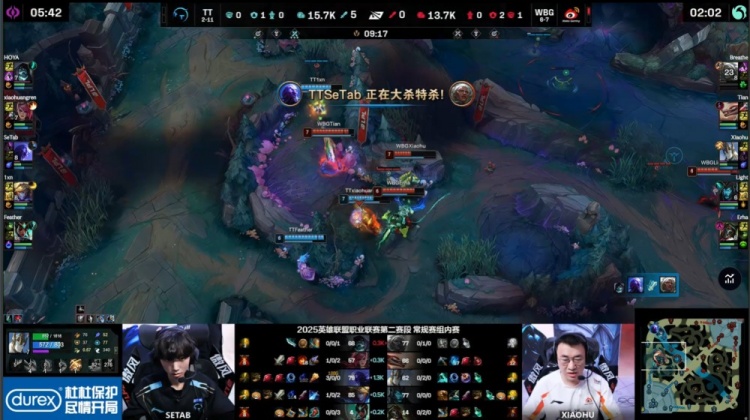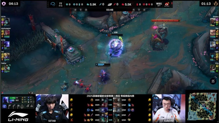 前期Setab瑞兹中路TP回线直接打出单杀拿下一血,xiaohuangren蔚控图节奏飞起,下路连续击杀Erha烈娜塔,TT全面打开局势。巢虫团战中,Setab收掉xiaohu加里奥,Hoya与Setab又在上路击杀Breathe安蓓萨,TT经济领先2k。