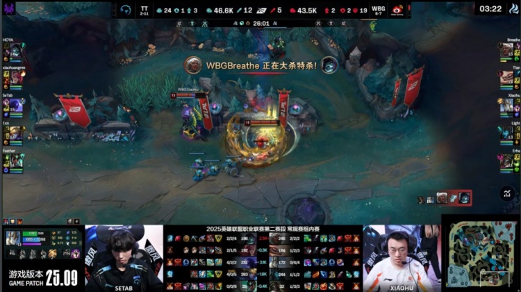 【24:43】Setab瑞兹中路再次被逮捕,送Light卡莉丝塔人头,随后HOYA下路带线又被Breathe逮捕击杀,TT正面四人开大龙被劝退,中路团战,小黄人锁进人群被Erha烈娜塔大招魅惑融化,xiaohu残血撤退,WBG经济落后1k。