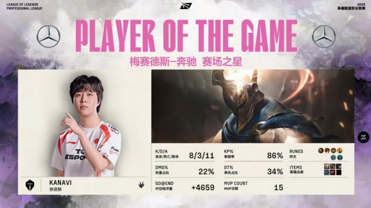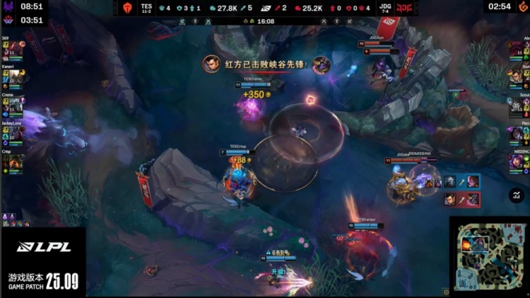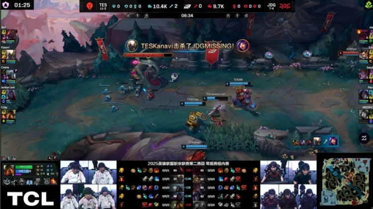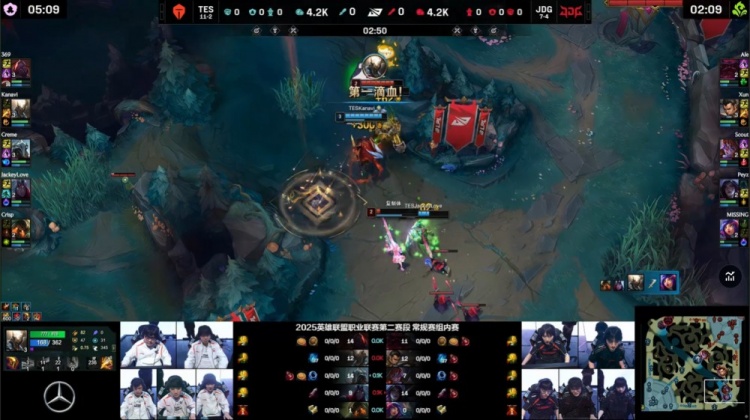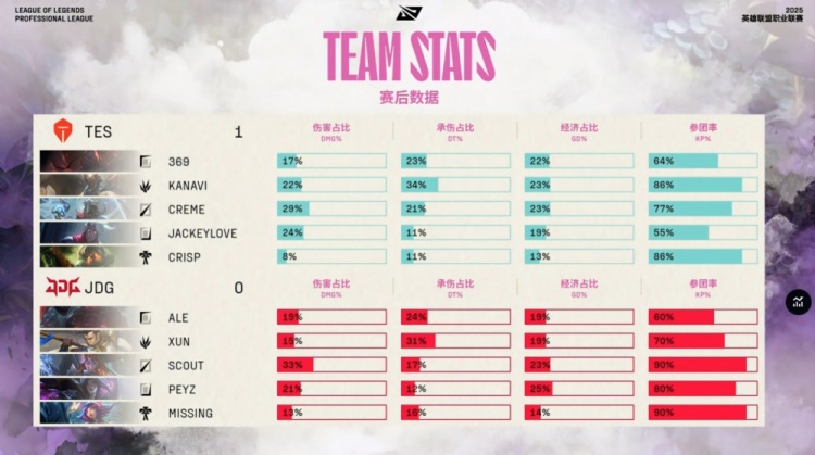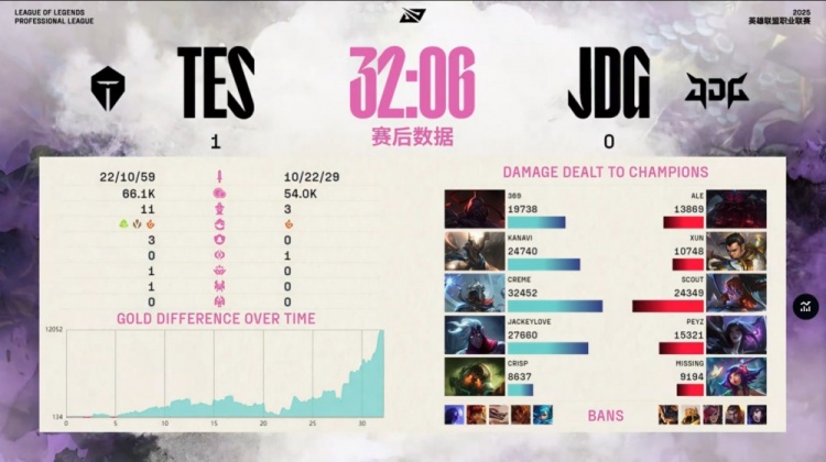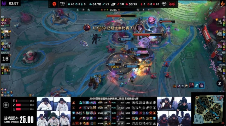 后期TES再度控住河道,打出0换2后顺利拿下大龙,经济领先扩大至5k。关键团战中369赛恩与Kanavi潘森接连收割,TES团灭JDG后三路推进,先下一城。